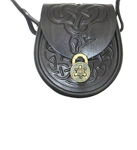 Celtic Dragon Leather Handbag with Celtic dragon design on flap, and Celtic knot-work design on front. The bag fastens with an antique turn lock.