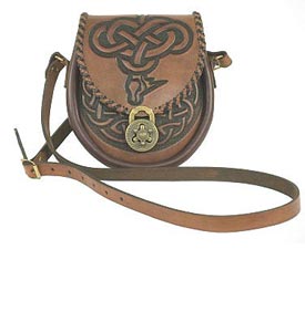 Celtic Dragon Leather Handbag with Celtic dragon design on flap, and Celtic knot-work design on front. The bag fastens with an antique turn lock.